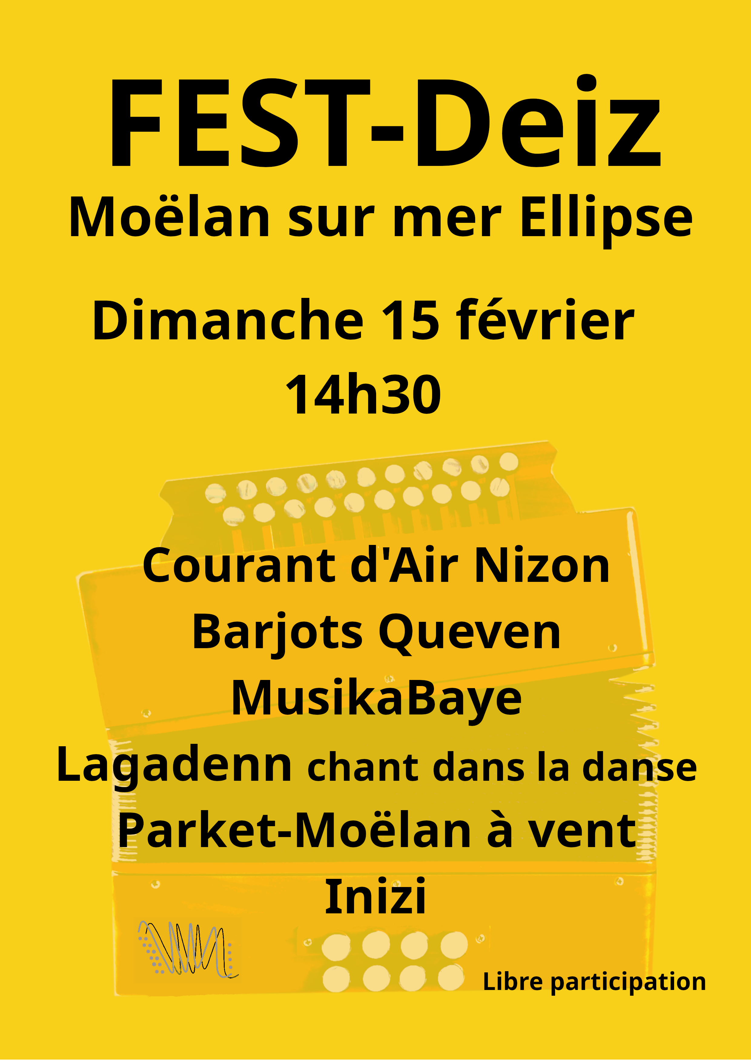 Nous vous donnons rendez-vous à la salle de spectacle de l’Ellipse de Moëlan sur mer, le 15 février 2026, pour un fest-deiz entre copains.